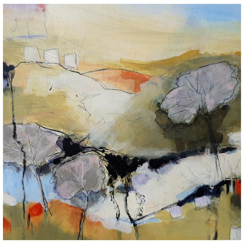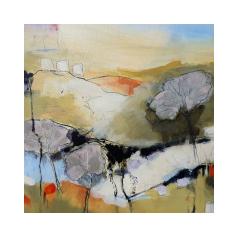 Intangibles of intense mood, energy and atmosphere. Influenced by a background in exhibition design, I am interested in the structure of the landscape, considering both past and present. From observation while out in the landscape, from memory and the feel of the ambience of a selected place, starting a piece with mark making, working with acrylic, mixed media and print, each piece of work is a journey, emotionally developing slowly, building up layers over time. Collecting knowledge of a particular site by visiting frequently throughout the seasons, sketching, alongside photographs, and working back in my studio, I take elements of the landscape, exploring the literal quality, and by a process of deconstructing and reassembling my intention is to preserve the spirit of the original location in an semi abstracted way but still retain the elements of structure and atmosphere through line and colour without losing all recognition of place.